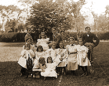 Franklin Delano Roosevelt posing with twelve cousins at Delano Homestead, Fairhaven, MA.